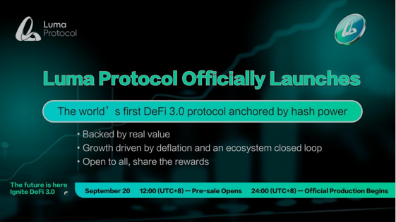 On September 20, 2025, Luma Protocol announced its official launch, marking a historic milestone for decentralized finance. At 12:00 (UTC+8), Luma opened its pre-sale, followed by the release of the first mining rewards at 24:00 (UTC+8) on the same day. This launch represents not just the birth of a new protocol, but the arrival of the world’s first DeFi 3.0 system anchored in Hash Power.